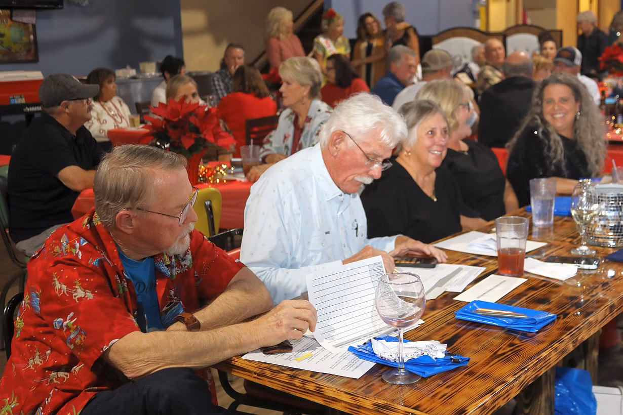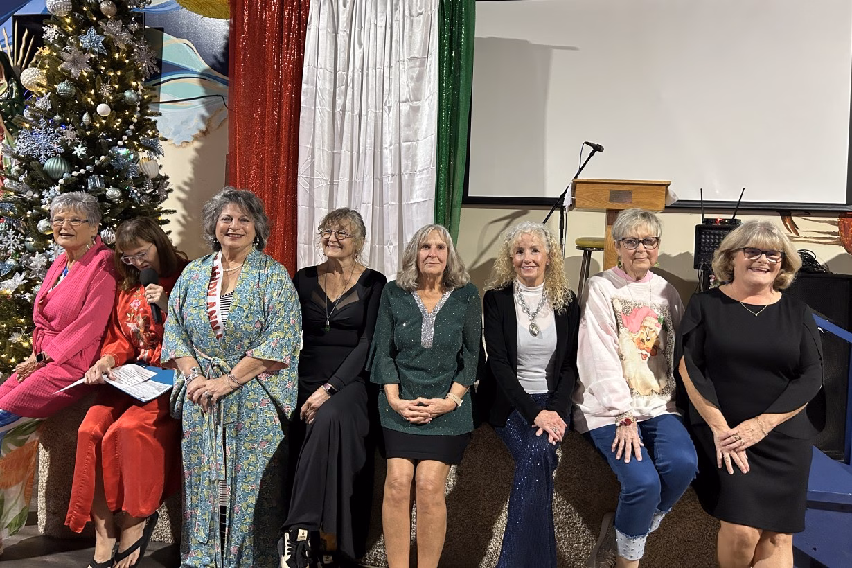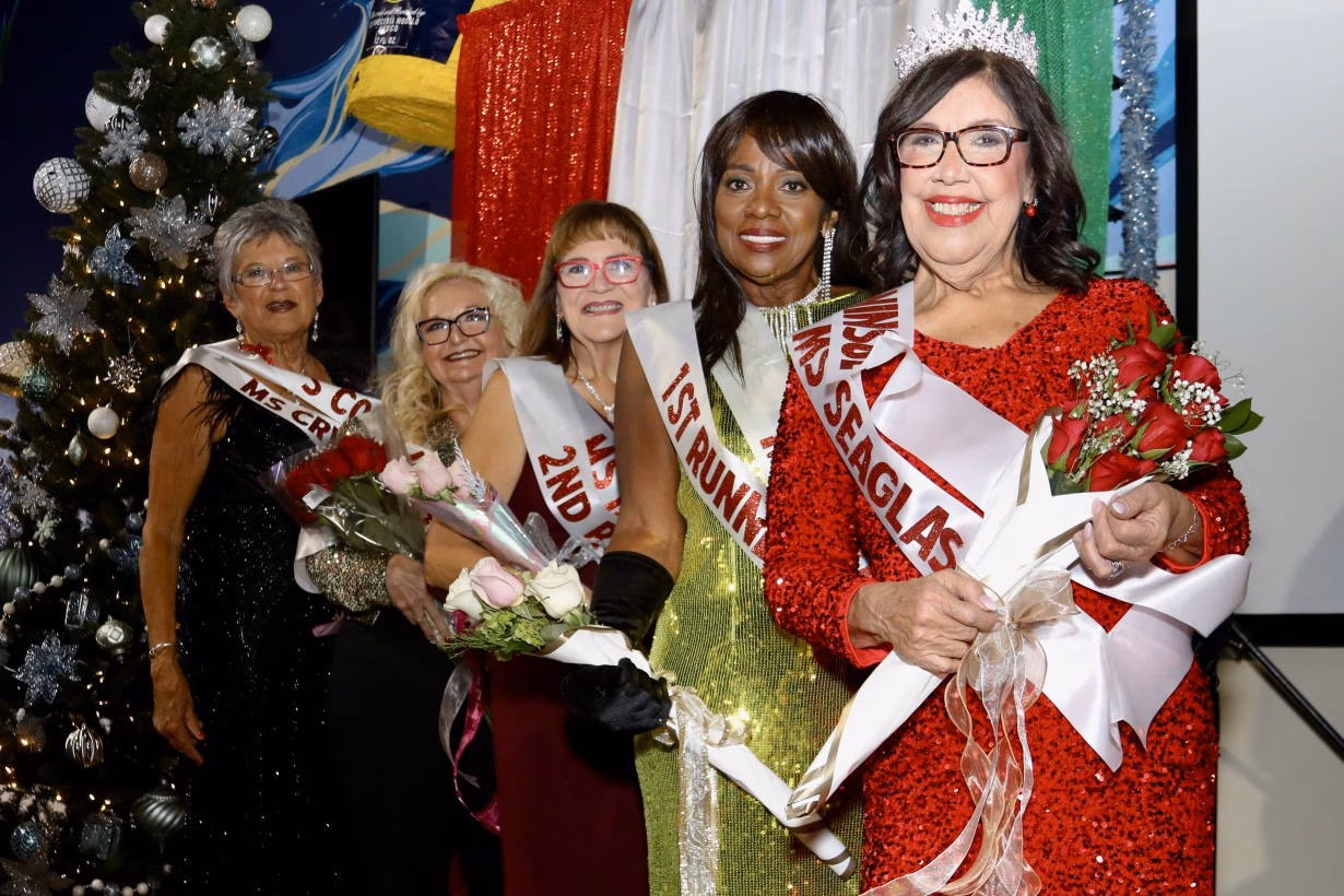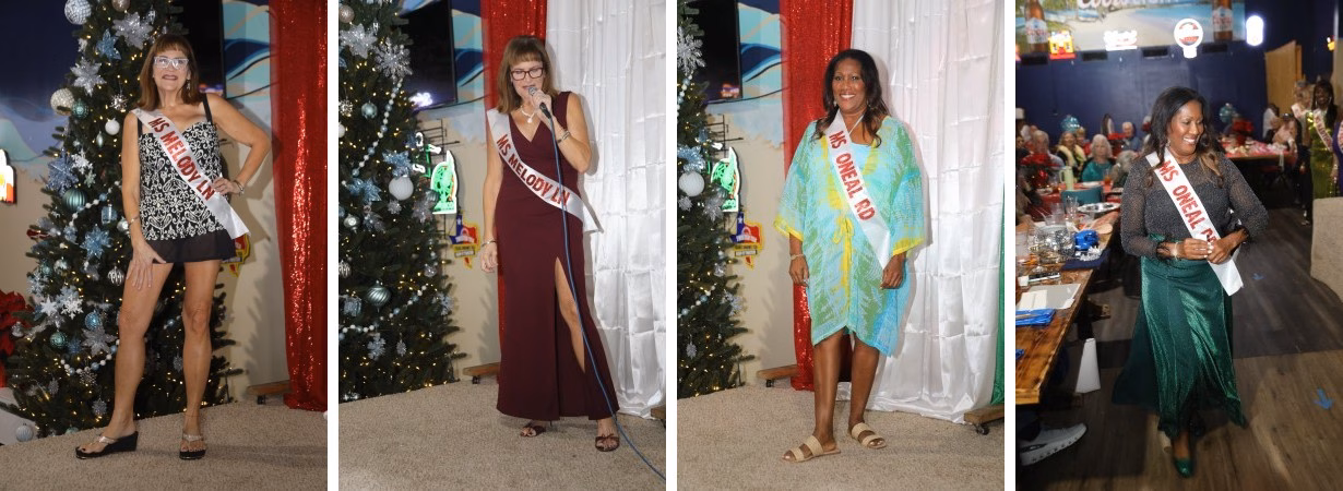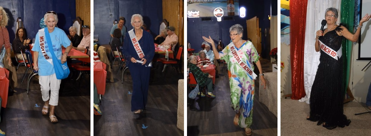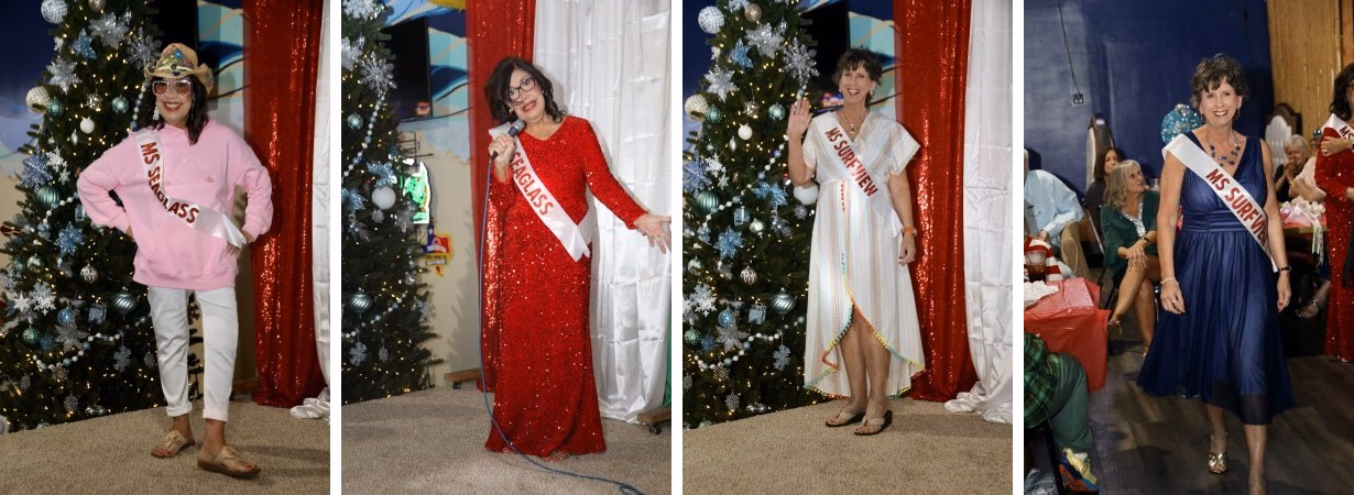 Last Tuesday evening,, December 9, 2025, the Bolivar Peninsula Cultural Foundation had its annual meeting at Jose’s and we presented the first (and probably the last) Senior Ms Bolivar Peninsula Pageant for our entertainment for the evening. The Cultural Foundation has been blessed with being able to use Jose’s back event room once again to host this year-end meeting, a requirement of the foundation’s bi-laws. Instead of just the usual appetizers, short meeting and poinsettia door prizes, the Cultural Foundation has been shaking it up the past few years by providing a free drink ticket to new or renewing members, a great table of desserts to compliment the appetizer meal served, three great door prizes AND the poinsettia table decorations and for the third year has provided entertainment for the evening. Two years ago there was a talent show, last year was a fashion show, showcasing clothing from Second Going our local thrift store run by Bay Vue Methodist Church, and this year we provided a pageant with 10 contestants all 65 years or more of age.