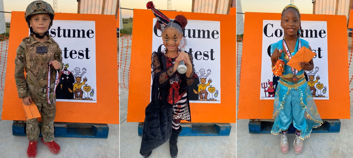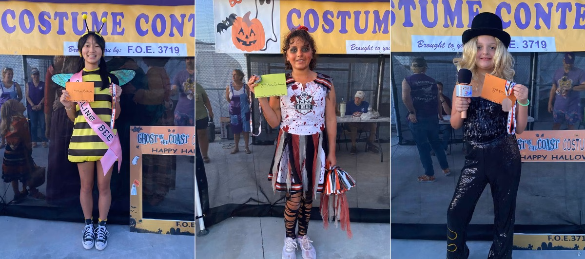 Although there were many contests most everyone received something. What an artistic bunch decorated so many interesting venues. Among the many clever TRUNK OR TREAT entrees three emerged as prize winners. Big Store’s Dee presented me with photos and list. First place went to Robin Mackey’s deathly pirate ship. Jessika Neil and cute girls won second while fearless ringleader Callie Defoe, with a sweet looking lion, placed third.